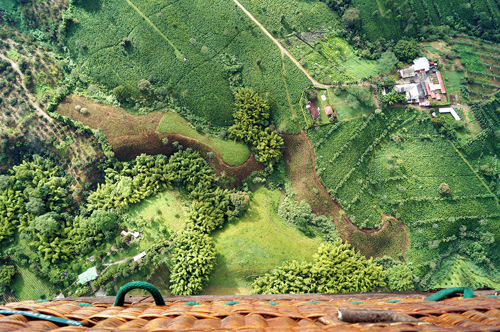 El vuelo se realiza en Globo Aerostático a primeras horas de la mañana, hora donde se dan las mejores condiciones meteorológicas disfrutando de una deliciosa taza de café de cosecha propia, mientras participamos del proceso de inflado del globo, el cual tiene capacidad para 4 turistas más el piloto. Debido a que el Globo no cuenta con timón, en el vuelo vamos a merced del aire, pero no hay ningún motivo para preocuparse, nuestro piloto cuenta con más de 15 años de experiencia, razón por la cual solo nos tenemos que dejar maravillar de la maravillosa vista. Dado a que no podemos precisar con exactitud el punto de aterrizaje, vamos en constante comunicación con el equipo de seguimiento por tierra, el cual nos recogerá en el punto de aterrizaje, y nos llevará de regreso al lugar de despegue.